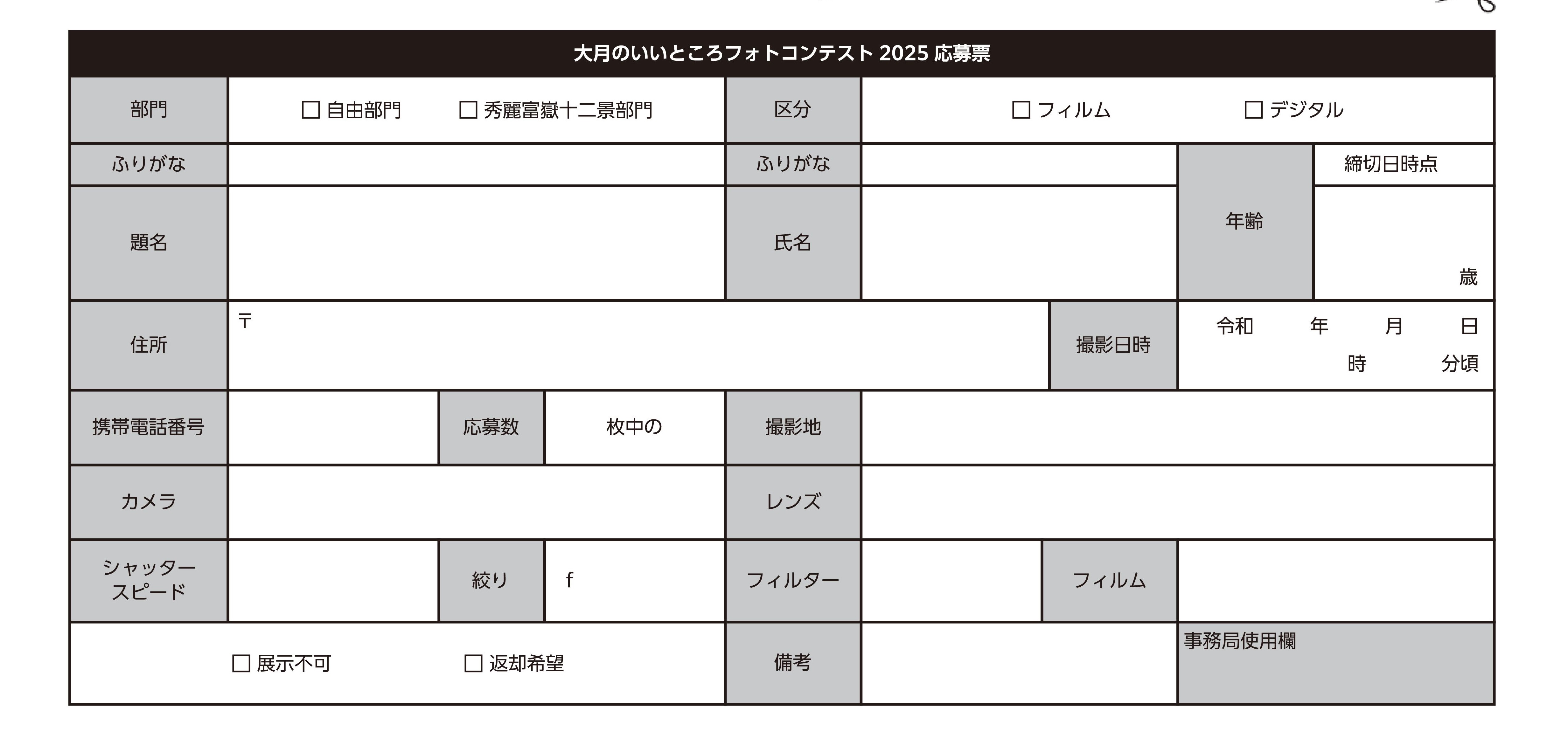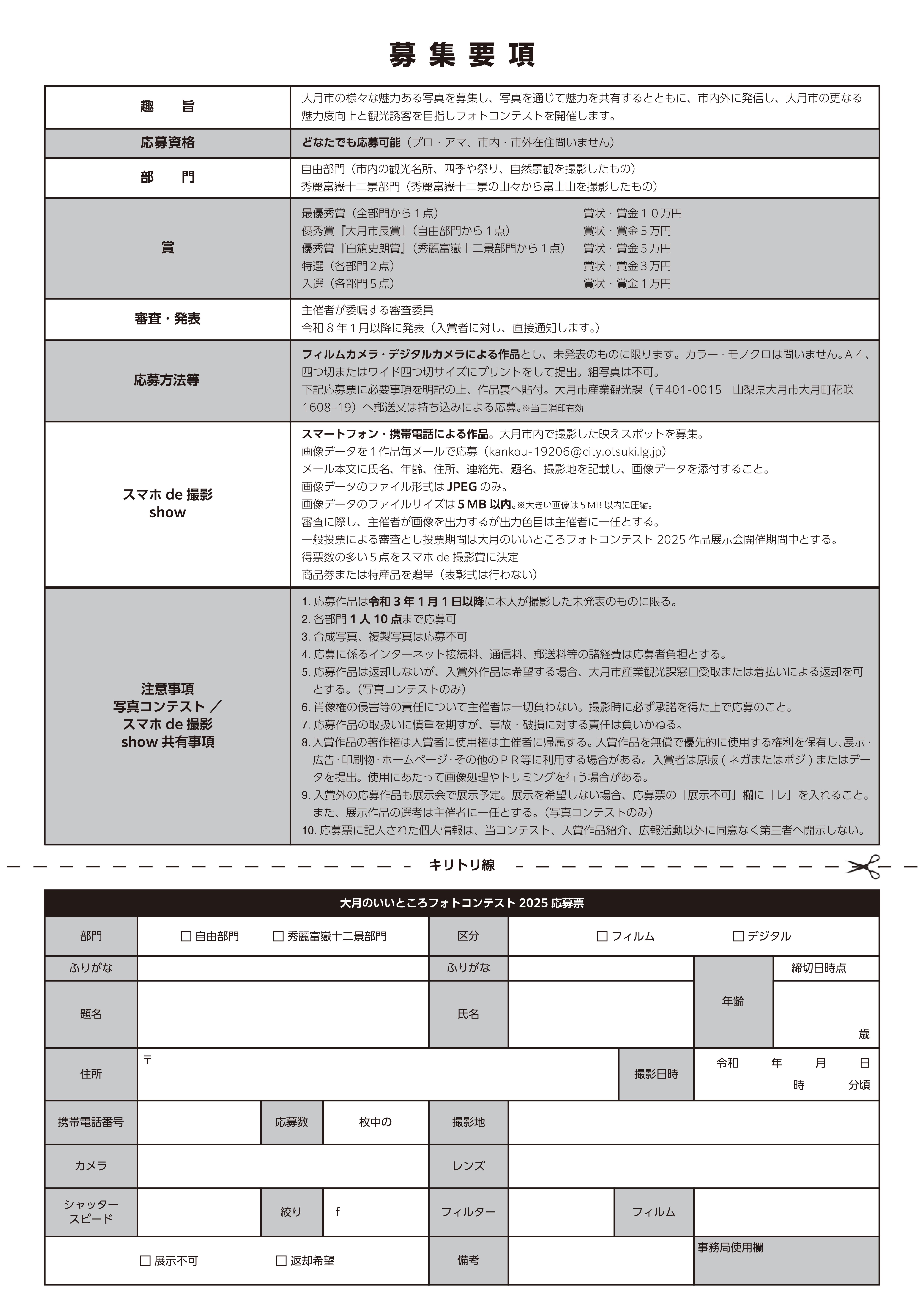 5.応募作品は返却しないが、入賞外作品は希望する場合、大月市産業観光課窓口受取または着払いによる返却を可とします。(写真コンテストのみ)