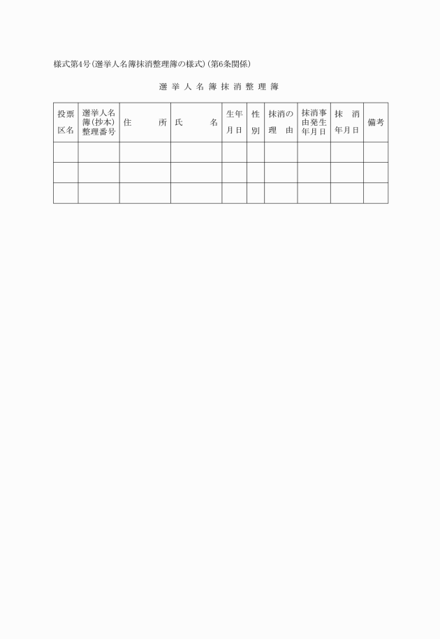 第6条 委員会は、法第28条《登録の抹消》の規定により選挙人名簿から抹消をしたときは、様式第4号により整理するものとする。