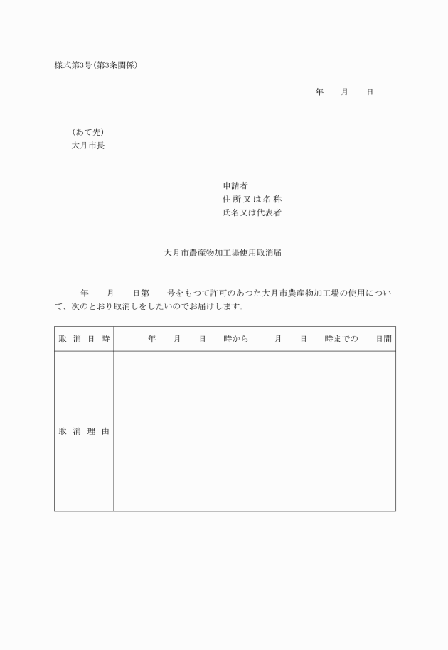 第5条 使用者は、加工場の使用を完了したときは、大月市農産物加工場使用完了届(様式第6号)を市長に提出しなければならない。