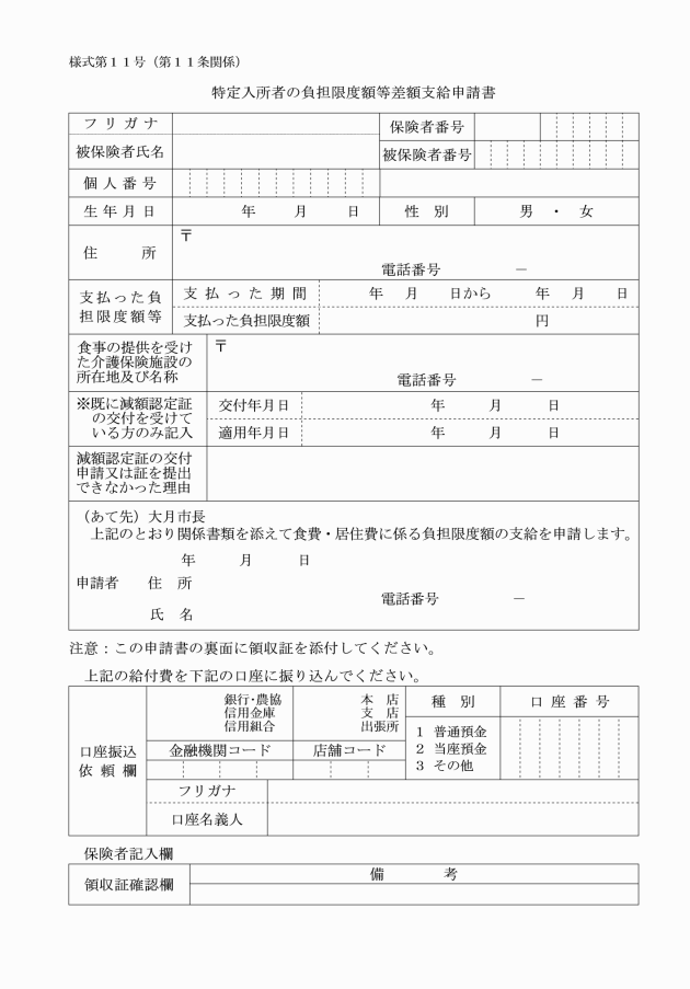 (特定入所者の負担限度額の差額の支給申請書)
