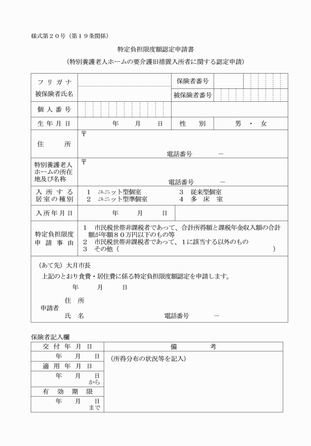 第19条 省令第172条の2の規定により準用する省令第83条の6第1項の申請に係る標準様式は、介護保険特定負担限度額認定申請書(様式第20号)とする。