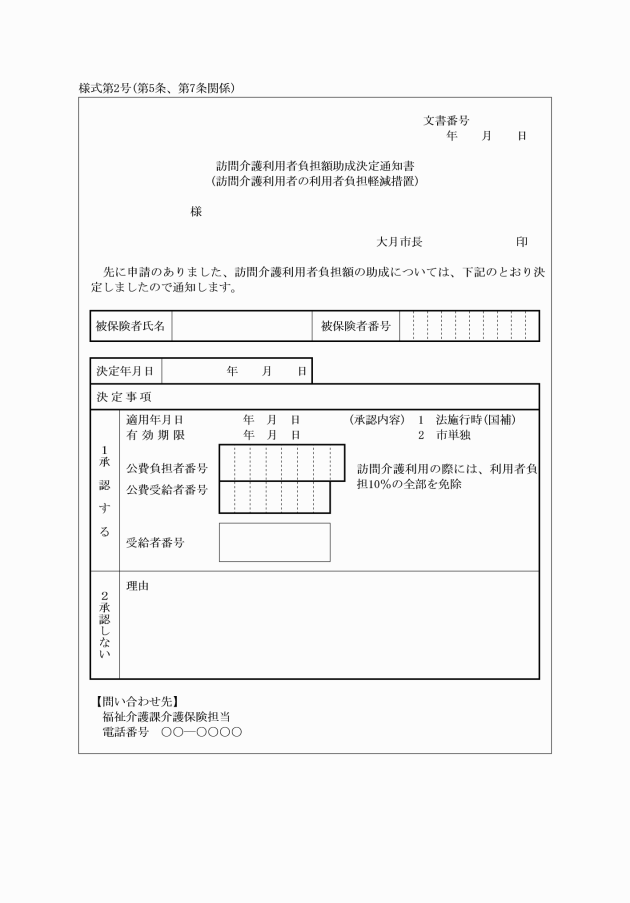 第9条 認定証の交付を受けた者が、住所又は氏名を変更したときは、14日以内に訪問介護利用者負担額助成認定証記載事項変更届(様式第5号)を市長に提出しなければならない。