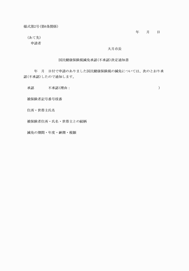 第6条 市長は、保険税の減免の承認又は不承認を決定したときは、国民健康保険税減免承認(不承認)決定通知書(様式第2号)により速やかに当該申請者に通知するものとする。