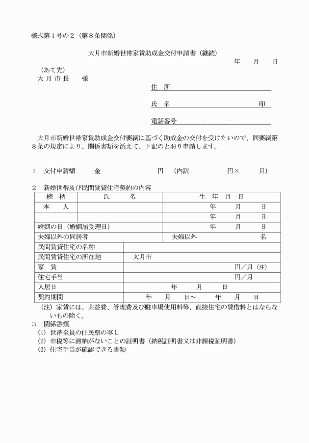 第5条 申請者は、賃貸借契約の締結者とし、大月市新婚世帯家賃助成金交付申請書(新規・継続)(様式第1号。以下「申請書」という。)に次に掲げる書類を添えて市長に提出するものとする。