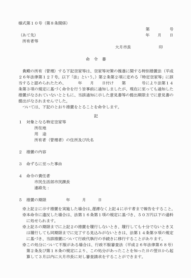 2 命令後、特定空家等の所有者等が措置を実施した場合は、改善報告書により市長へ報告するものとする。