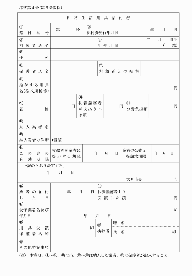 4 市長は、用具を納付した業者からの請求により、給付に必要な用具の購入に要した額から前項の規定により扶養義務者が直接業者に支払った額を減じた額を支払うものとする。