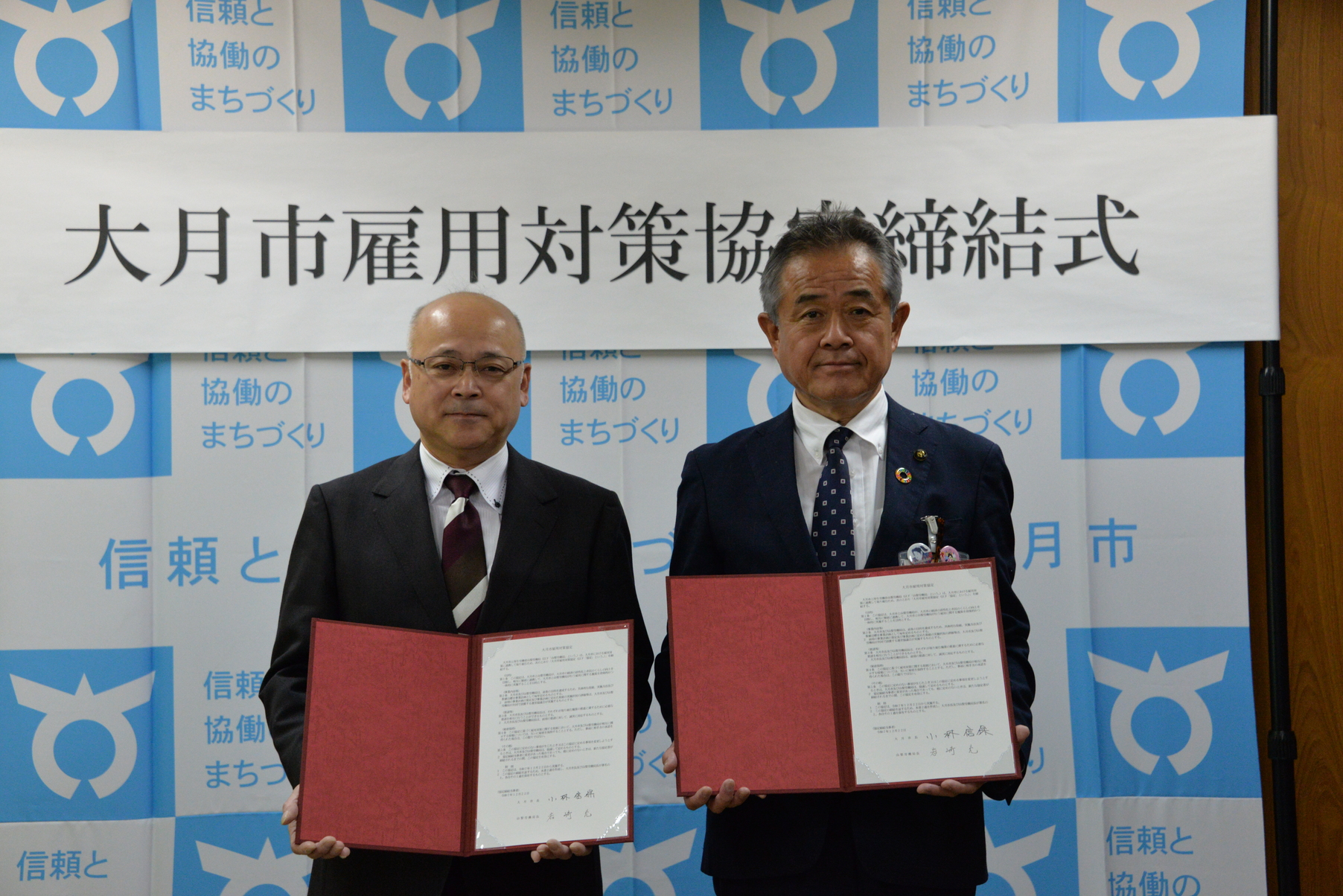 大月市と山梨労働局は、市内の雇用問題に対応するため、また、市と国が行う雇用に関する施策を効果的かつ一体的に実施するため、「大月市雇用対策協定」を締結しました。